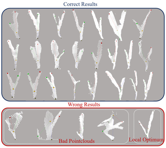 After testing, the OPVSM successfully fitted the actual poses of 45 tea buds out of the total samples. The accuracy of this method was around 90%. The wrong results were primarily due to the bad pointclouds and local optima. As shown in Figure 17, the imprecise bounding boxes and measurement instability of the depth camera led to the acquisition of bad pointclouds. Additionally, the search process may have been affected by the initial parameters of the algorithm, resulting in local optima.