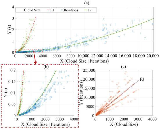 The primary independent variable is the cloud size. As the cloud size increases, the number of iterations also increases proportionally, while the processing time increases exponentially. The proportional function (F3) was identified between the cloud size and number of iterations, with a coefficient a of 6.375. Although the SSE and RMSE of this fitting curve were large, indicating that the data points in Figure 18c were scattered, the fitting curve had strong explanatory power and a good fitting result due to a high R-square value of 0.9995.