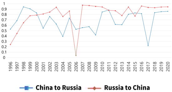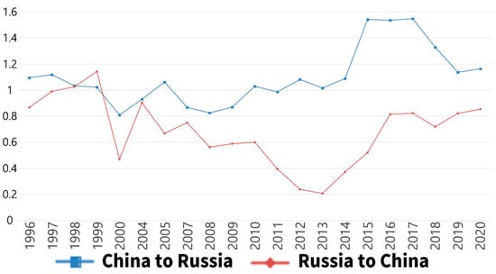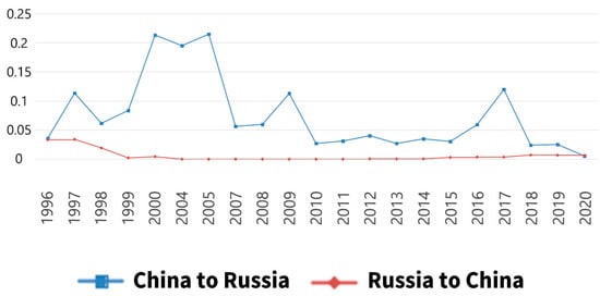 | Year | China–Russia Value of Exports | Russia–China Value of Exports | Total Grain Trade between China and Russia | Grain Trade Balance between China and Russia | Surplus Country |