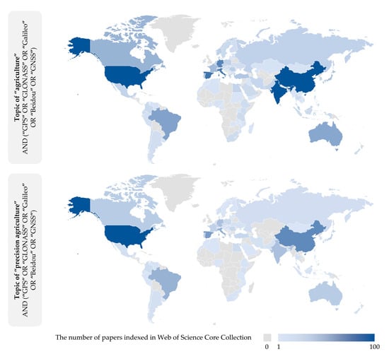 The United States was the global leader in the total scientific papers indexed in the WoSCC with the topics of GNSS in combination with both “agriculture” and “precision agriculture” (Figure 2, Table 2). China and India were the second and third-ranked countries in terms of scientific production, with China as the leading country for its native BeiDou system. Despite falling behind these three countries in terms of quantitative research numbers, several European countries (France, Germany, England, and Spain) were among the leading countries in PA research based on GNSS. While the majority of the world countries had scientific contributions in this field, the vast majority of African countries had no presence in the analyzed papers. Moreover, they would likely greatly benefit from introducing GNSS in PA in greater quantity [39,40].