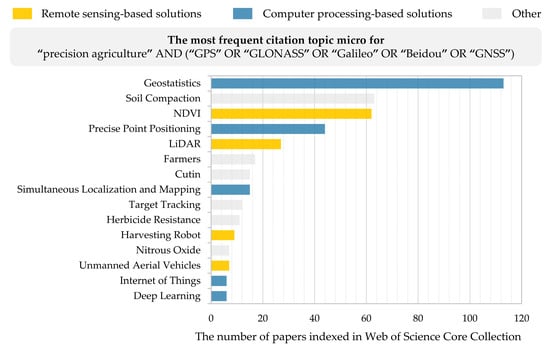 The search and analysis of the citation topic micro was performed as the subset of generalized TS = (precision agriculture AND (GPS OR GLONASS OR Galileo OR Beidou OR GNSS)) search query, including all studies which utilized GNSS in PA indexed in the WoSCC. Since these studies had their citation topics micro-defined and classified by the Web of Science, all results from the search query were retained in the review without additional filtering. The citation topics micro included recently published classifications of scientific studies by the Web of Science, including more than 2500 micro-level citation topics. This classification is hierarchically below the Web of Science subject categories and citation topics meso, enabling a specific and objective assessment of technologies used in the search query.