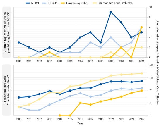 Among the top remote sensing-based solutions from the citation topics micro, NDVI, light detection and ranging (LiDAR), harvesting robot, and unmanned aerial vehicles were the most represented. While NDVI and LiDAR had a slightly growing representation in both agriculture and PA studies, unmanned aerial vehicles and harvesting robots have been rapidly researched since 2010 and 2016, respectively (Figure 4). While GNSS is a crucial component of all these solutions, it was a primary focus of the research in slightly more than 10% of the analyzed studies for NDVI, LiDAR, and harvesting robot (Table 3).