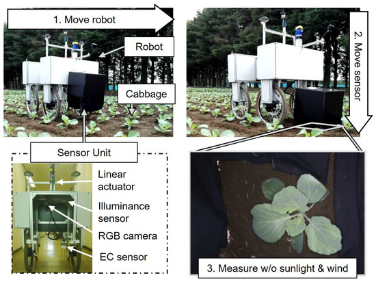 Localized management based on multipoint measurements of crops and soil is expected to improve agricultural productivity. The difficulties with this process are as follows: it is time-consuming due to the many measurement points; it requires various sensors for various measurements; it can lead to unstable measurements due to sunlight and wind. To solve the above issues, the system we propose has the advantages of efficient measurements performed by a robot, various measurements performed through exchangeable sensor units, and stable measurements through protecting the crop from sunlight and wind. As a pilot study for the system, we conducted an experiment to simultaneously measure the crops and soil in a cabbage field. The robot achieved mobility in the field, >4 h of operation time, and the ability to obtain soil electrical conductivity measurements and crop imaging at 100 points. Furthermore, the stability of the measurement conditions within the sensor unit during the experiment was evaluated. Compared to the case without the covering, the illuminance became 280-fold stabler (standard deviation = 0.4 lx), and the wind-induced crop shaking became 20-fold lower (root mean square error of the image pixels = 0.5%). The potential impacts of this research include high reproducibility because of the shareable sensor unit and the expectation of new discoveries using precise indoor sensors.