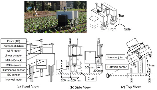 When conducting measurements in a crop field, it is important to measure the crops themselves (rather than just the soil). Apart from changes in soil nutrient levels, disease-related damage is also an important reason for poor crop growth, and this can be diagnosed using RGB images of crops [8]. Determining whether crop growth is appropriate requires a crop growth model, which can be developed using various factors (such as crop leaf area) [9]. Research on robots with measurement functions, including crop imaging, uses unmanned aerial vehicles [10,11,12] and unmanned ground vehicles [13,14,15,16,17,18].