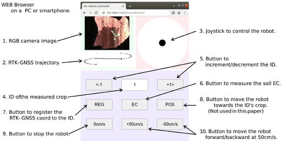 The robot is controlled using a web server with an ROS interface, as shown in Figure 4. We used open-source software [20,21] for the web server bridging ROS. As shown in Figure 5, the functions of the GUI include displaying a camera image and RTK-GNSS trajectory, controlling the robot’s wheels, performing measurements, and specifying the crop ID to store the sensor data. The GUI written in HTML is displayed by accessing the address of the web server PC on the robot from a web browser on an external PC or smartphone. The command of the driving speed was limited by the software to 50 cm/s for safety.