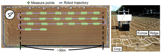 In the experimental field, cabbage plants were transplanted at 40 cm intervals in ridges placed 60 cm apart (furrow width, 10 cm). The set of dimensions represents a general value in the Japanese cabbage field. Measurements were conducted for up to 3 weeks after transplanting (topdressing stage), when the distance between crop leaves was approximately 10 cm. The field (size, ∼1.25 a = 125 m2) contained approximately 1000 crops divided into 20 parcels. During the measurement period, the robotic unit measured soil at 100 points, with 5 points per parcel. The measurement system is discussed in detail below.
