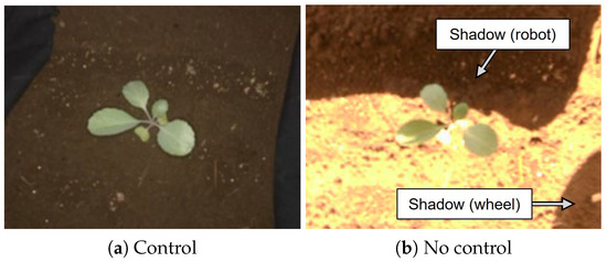 Images of an individual cabbage were captured with the sensor unit lowered onto the plant (Figure 8, left) and raised to a height of 30 cm above the ground (Figure 8, right). When the unit was raised, the robot’s body and wheels cast shadows on the plant, and the color of the plant varied by location. In images captured with the sensor unit covering the crop, the lighting conditions were improved because the sensor unit blocked the sunlight.