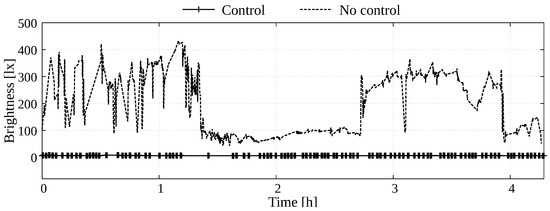 The measurements recorded by the illuminance sensor were analyzed to quantify the lighting conditions (Figure 9). When the sensor unit was raised, the illuminance varied greatly (ranging from several tens of lux to >400 lux; Figure 9, dashed line). These fluctuations can be attributed to the effects of clouds and other factors dependent on the direction of travel of the robot. On the day of the experiment, the sky was clear with occasional clouds. Therefore, there were instances during the experiment when the sun was covered by clouds, resulting in lower illuminance. Additionally, the relative positions of the sensor and the robot changed every time the robot changed its direction of travel. This may also have caused differences in shadow formation, leading to changes in illuminance levels.