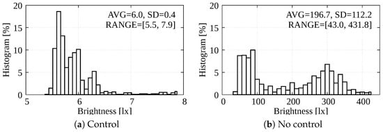 Figure 10 shows the histograms of illuminance levels. When the sensor unit was raised (left; mean illuminance, 196.7 lx; standard deviation, 112.2 lx; minimum, 43.0 lx; maximum, 431.8 lx), the illuminance levels showed large fluctuations. The two peaks (Figure 10b) were considered to correspond to the presence or absence of shadows (caused by clouds or the position of the robot). When the sensor unit covered the crop (mean illuminance, 6.0 lx; standard deviation, 0.4 lx; minimum, 5.5 lx; maximum, 7.9 lx), the illuminance levels were relatively stable. A comparison of the standard deviations revealed that using the sensor unit could improve the stability of illumination levels 280-fold.