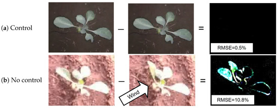 Images of an individual cabbage plant with a maximum difference of 0.1 s between consecutive images, and the subtracted image. (a) With the sensor unit covering the plant, the root mean of the squared error (RMSE) between the images was 0.5%. (b) With the sensor unit not being used, the leaves are shaken by the wind and the maximum RMSE was 10.8% (20-fold greater).