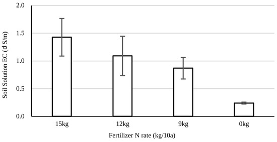 Relationship between the electrical conductivity (EC) in the soil solution (vertical axis) and the basal fertilizer rate (horizontal axis). The error bars represent the standard deviation.