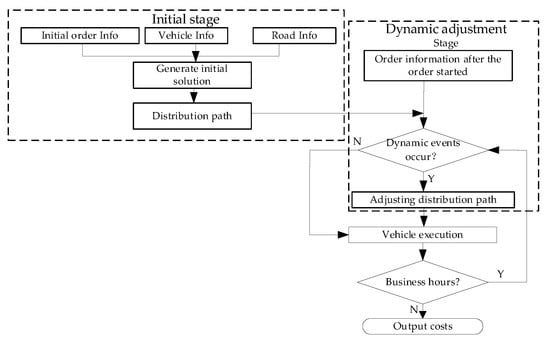 In this paper, a combination of the initial distribution path and dynamic adjustment strategy is used to solve GCVRPDD. The concept is shown in Figure 1.