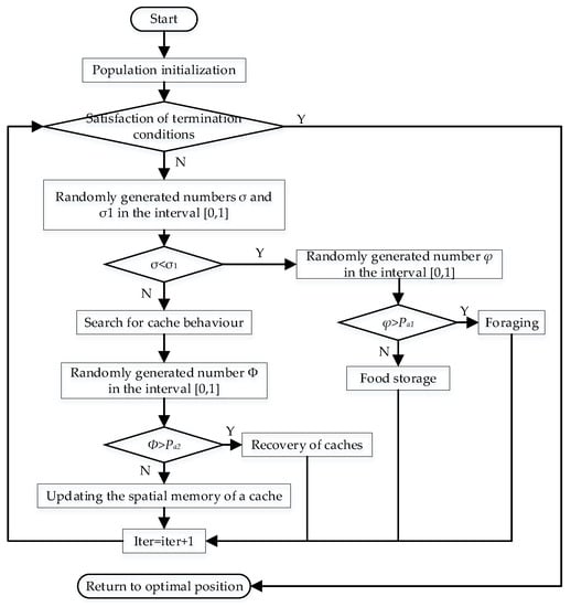 - Movement strategy. Each nutcracker performed foraging, storing food, searching for caches and obtaining food behaviors according to Equations (45)–(51), respectively, based on its current food search status. denotes the position of the nutcracker in the generation. and denote the upper and lower bounds of the nutcracker’s position at the point . is a random number generated from a levy flight. denotes the average position of all nutcrackers at point in the generation. , and are three nutcrackers randomly selected from the population to facilitate the search for high-quality food sources. , , and are real numbers randomly generated in the interval . is randomly generated in the interval based on a normal distribution.