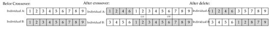 Multiple crossovers can avoid individuals from converging prematurely, but too many crossovers will destroy some better solutions. In this paper, according to the roulette strategy, two crosses, and , are selected. After the two individuals have been crossed, the recurring points are deleted, resulting in two new nutcrackers. The process is shown in Figure 5.