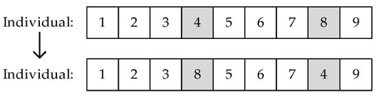 Select two random positions and directly exchange them to complete the mutation operation, as shown in Figure 6.