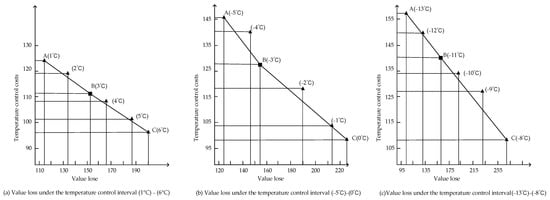 Figure 7 shows that the temperature control cost and value loss both change with temperature, but they are both paradoxical. When the temperature is at the left end of the interval, the value loss is the smallest and the temperature control cost is the largest. Conversely, when the temperature is the right endpoint of the interval, the commodity is at a higher temperature. The loss is the largest and the temperature control cost is the smallest. This indicates that under a constant external temperature, the value loss gradually increases and the temperature control cost gradually decreases with increasing temperature. The value loss and temperature control costs were different in the increase or decrease during the temperature change. Based on the Pareto optimal principle [41], the optimal temperature in the temperature control intervals (1 °C)–(6 °C), (−5 °C)–(0 °C) and (−13 °C)–(8 °C) are 3 °C, −3 °C and −11 °C, respectively. When the temperature is at its optimum, adjusting the temperature up or down does not result in an optimum.