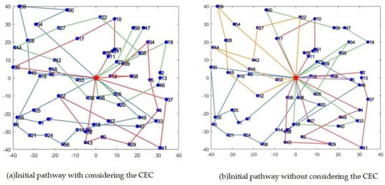 - In order to improve the quality and diversity of the initial population, two different methods were used to generate the initial population in this paper. The two methods are, respectively, the CW saving algorithm and the Random method.