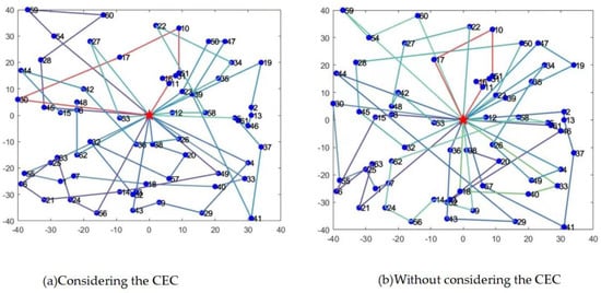 The AH-NOA was used to solve the vehicle path problem with and without considering carbon emissions. The initial distribution path is shown in Figure 8. Figure 8a shows that eight vehicles were dispatched. Figure 8b shows that nine vehicles were dispatched. There are some differences in the vehicle paths for the two distribution schemes, which are mainly due to whether or not carbon costs are taken into account. The specific routes for the two distribution schemes are shown in Table 6 and Table 7, respectively. The stars in Figure 8 represent distribution centers and the dots represent customer points.