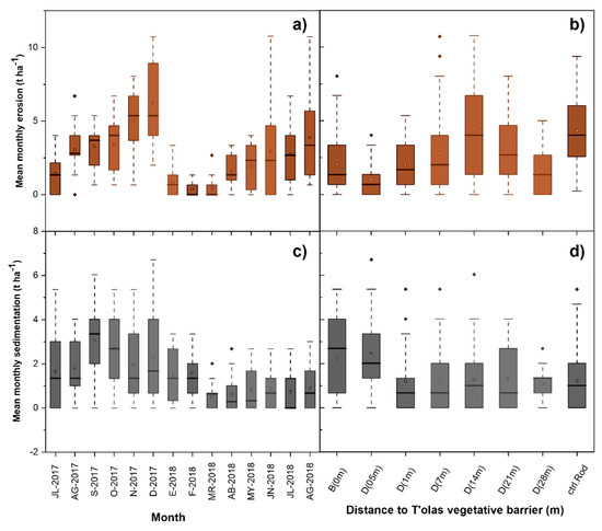 Sedimentation is an inverse process to erosion, and based on the results, statistical differences (p < 0.05) were found over several months in 2017–2018. Significant differences were found (p < 0.05) for various distances to the t’ola vegetative barrier (Figure 2d). September 2017, March 2018, and October 2017 had the highest sediment accumulation values of 3.05, 2.93, and 2.36 t ha−1 month−1, respectively. Furthermore, a statistical group with minimum values was highlighted (below 0.67 t ha−1 month−1), corresponding to April, May, June, July, and August 2018 (Figure 2c).