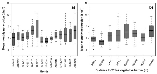 Mean monthly net soil erosion during the agricultural period July 2017–August 2018 at the southern Altiplano (Rodeo community, ‘ctrl.Rod’): (a) soil net erosion (t ha−1); (b) soil net erosion at different distances (m) of vegetative t’ola barriers.