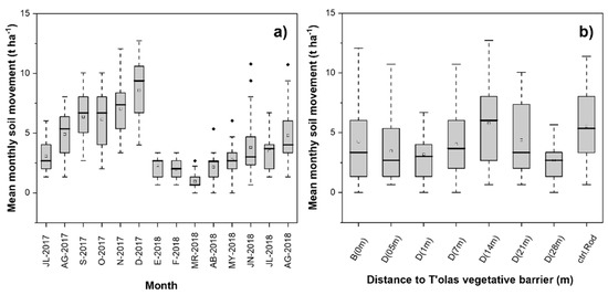 Mean monthly soil movement throughout the agricultural period July 2017–August 2018 at the southern highlands (Rodeo community, ‘ctrl.Rod’): (a) soil movement (t ha−1); (b) soil movement at different distances (m) from vegetative t’ola barriers.