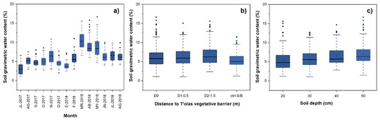 Monthly soil gravimetric water content evaluated in the Rodeo community: (a) soil moisture (%), (b) soil moisture (%) at different distances from the t’ola vegetative barrier, and (c) soil moisture (%) at different soil depths.