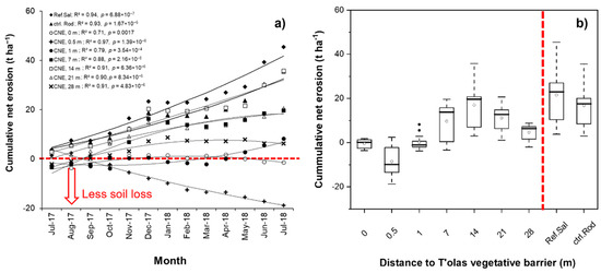Cumulative net erosion (CNE) during the months of the agricultural year 2017–2018 and distance to the t’ola vegetative barrier: (a) CNE accumulation along the months, CNE values below to zero correspond to less soil loss; (b) accumulated CNE according to the distances to the vegetative barrier, plot references of Sivingani community in Salinas G.M. (Ref.Sal) and the control plot in Rodeo community (ctrl.Rod) used to compare cumulative CNE without vegetative barriers. Results significantly differ among barrier distances and months (p < 0.05).