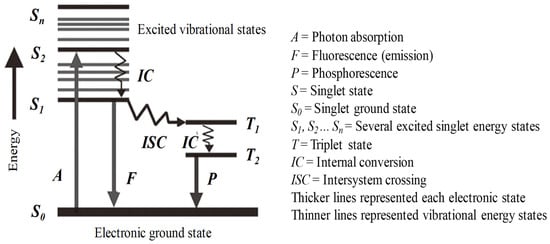 Fluorescence occurs when a fluorophore (fluorescent molecule, atom, or nanostructure) relaxes to its ground state after absorbing a photon. Usually, the absorbed photon is in the UV range, and the emitted light is in the visible range, but this depends on the absorbance curve and Stokes’s shift of the particular fluorophore. Once a molecule has absorbed photon energy in its ground state, i.e., the statistically most common energy state for room-temperature chemical reactions, it will be excited to a higher singlet state and often to a higher vibrational level in the excited states. Since excited states are unstable, the molecule will lose its excess energy and return to its ground state via several routes. Figure 1, termed a Jablonski diagram [57], shows a few of these energy dissipation processes. Following the absorption of a photon, the molecule will relax to a lower energy level in various pathways. The most likely is the relaxation to the lowest vibrational energy level of the first excited singlet states, (e.g., Sn → S1), which is called internal conversion (IC). The molecule will finally return from the lowest excited energy state to the ground state, i.e., if the photon emission occurs between states of the same spin state (e.g., S1 → S0), this is termed fluorescence (line F). If it occurs between different spin states, i.e., from triplet state to the ground state (e.g., T1 → S0), the process is called phosphorescence (line P) [54,58].