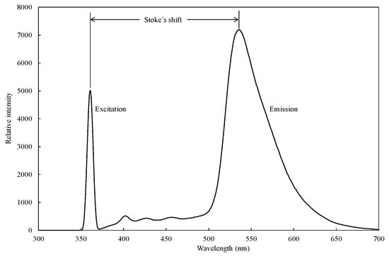 Fluorescent compounds have two characteristic spectra in common: an excitation spectrum, i.e., the wavelength and amount of light absorbed, and an emission spectrum, i.e., the wavelength and amount of light emitted, as shown in Figure 2. These spectra are often referred to as a compound’s fluorescence signature or fingerprint. No two compounds have the same fluorescence signature. The fluorescence excitation spectrum of a single fluorophore species in dilute solution is usually identical to its absorption spectrum. The absorption spectrum can, therefore, be used as a surrogate for the excitation spectrum. Under the same conditions, the fluorescence emission spectrum is independent of the excitation wavelength due to rapid internal conversion from a higher initial excited state to the lowest vibrational energy level in the lowest (S1) excited state. For many common fluorophores, the vibrational energy level spacing is similar for both the ground and excited states, which results in a fluorescence spectrum that strongly mirrors the absorption spectrum. This is because the same transitions are the most favorable for both absorption and emission. However, in solution (where fluorophores are generally studied), the details of the vibrational structure are typically lost, and the emission spectrum is a broadband [59].