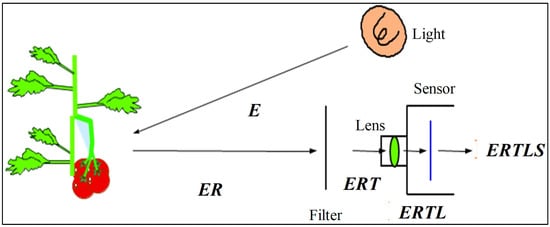 Energy flow from lighting device to TV camera, where E: Energy of light source, R: Reflectance of object, T: Transmittance of filter, L: Transmittance of lens, S: Sensitivity of image sensor. Adapted from [70].