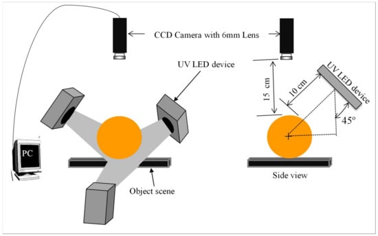 The fluorescence images of intact greenish group citrus were acquired using an image acquisition system composed of three sets of 365 nm UV LEDs (Figure 4) to compare with the spectral information results. The VGA format CCD camera (Sony ICX424AQ, Sony Corporation, Tokyo, Japan) of 8-bit gray levels fitted with a C mount lens of 6 mm focal length was placed 150 mm above from the fruit surface. To examine fluorescence oil cells, 10 mm × 10 mm area on the fruit skins was intentionally injured. Finally, after adjusted camera operation parameters such as iris: 1.4, shutter speed: 1/60 s, gain: 12 db, and gamma correction: 0.6, the target objects were oriented manually towards the camera and the image was captured.