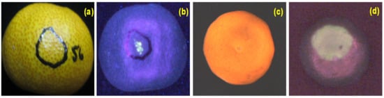 Fluorescence may be excited by X-rays, UV, or visible radiation. The fluorescence’s spectral distribution may range from the UV to the infrared, and the emitted light is always at a longer wavelength than the absorbed light due to limited energy loss by the molecule before emission. The most striking examples of fluorescence occur when the absorbed radiation is in the UV region of the spectrum, thus invisible to the human eye, and then emitted in the visible region [61,62]. For instance, most citrus species accumulate substantial quantities of fluorescent substances, most of which are associated with peel oil [63,64,65,66]. When the oil glands or cells of citrus are damaged or ruptured, the peel oil is released and migrates closer to the peel surface, allowing it to fluoresce and become visible when excited by UV light. For example, tangeretin, a component of peel oil, is a polymethoxylated flavone that fluoresces under UV light and is the likely source of the yellow fluorescence visible from damaged or decayed oranges [67]. Another example is heptamethoxy flavone, one of the major fluorescent substances in rotten citrus fruit that exhibits greenish fluorescence under UV excitation [68]. Except in rare instances, however, fluorescence from intact or unruptured cells is not observed. The application of fluorescence to detect surface defects, such as rotten, damaged, decayed, or injured parts, in a wide variety of citrus is, therefore, made feasible by the presence of these fluorescent substances that are associated with the rupturing of surface cells.