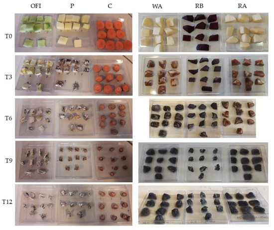 At T3, clear signs of desiccation also begin to appear on the potato samples. The other 3 VMs (OFI, C, and RB), although showing small changes, are still usable at T6. At 9 days (T9), OFI and C also show clear signs of desiccation, while, apparently, RB seems to resist better, probably because it has a higher dry residue and lower water content than the other three VMs at the start (Table 2). At T12, all matrices are strongly altered and their use as a source of water is certainly not recommended.