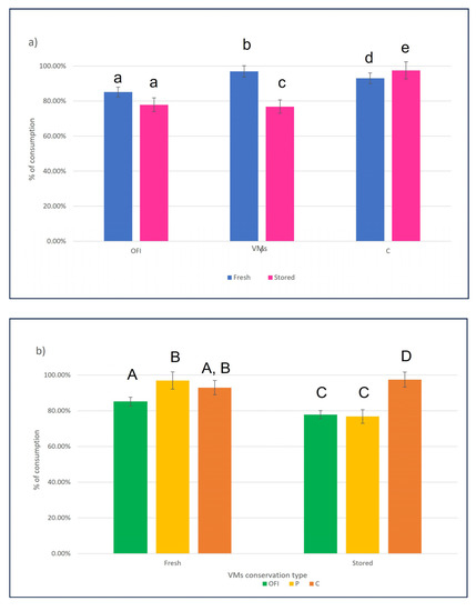 Figure 3a shows no significant difference between the consumption percentages of ‘fresh’ and ‘stored’ OFI. In contrast, the percentages of consumption between the ‘Fresh’ and ‘Stored’ matrices are significantly different for both P and C. Figure 3b shows that among the “Fresh” VMs, the consumption percentage of OFI is different from that of P, while C is not different from the other two. Furthermore, among the “Stored” VMs, the consumption percentage of C is significantly different from that of OFI and P.