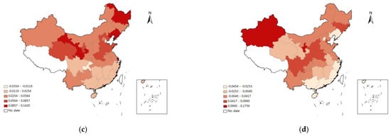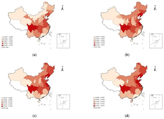 First, the temporal and spatial trends of the aging level of China’s rural labor force from 2011 to 2020 are shown in Figure 2a–d. Figure 2a–d shows the spatial distribution of the aging level of China’s rural labor force in 2011, 2014, 2017, and 2020, respectively. It can be seen that in 2011, the level of aging of China’s rural labor force was relatively low; the age of China’s rural labor force continued to rise from 2014 to 2020, with the highest concentration in the central region and the lowest concentration in the north and south. Second, the spatial-temporal change trend of China’s agricultural resilience from 2011 to 2020 is shown in Figure 3a–d. Figure 3a–d shows the spatial distribution of rural resilience in China in 2011, 2014, 2017, and 2020, respectively. It can be seen that in 2011, China’s agricultural resilience level was relatively high; over time, the level of agricultural resilience gradually declined, and now, the distribution is low in the east and high in the middle and west. The possible reason for this is that a large amount of the young labor force from the agricultural sector has transferred to cities and towns, resulting in a large number of left-behind elderly people in the rural population, which intensifies the aging of the rural labor force.