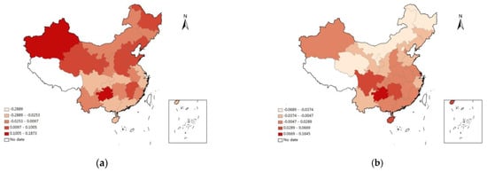 Here, Et is the level of agricultural employment industry in period t; Yt is the agricultural output level of period t. Et−1 is the employment level of the t − 1 manufacturing industry. WlnEt is a spatial lag term for manufacturing employment in neighboring areas; is a random error term. Finally, taking the actual agricultural output of China in 2007 as the starting point, the growth rate of China’s actual agricultural output was regarded as the counterfactual output growth rate of agriculture in each region, and the counterfactual output of agriculture in each region was calculated. The agricultural counterfactual employment in each region was calculated based on the agricultural counterfactual output obtained for each region. The counterfactual labor productivity was obtained by dividing the agricultural counterfactual output by the counterfactual employment in each region.