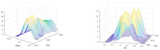 Finally, as shown in Figure 4, which depicts the core density diagram of the aging of China’s rural labor force and agricultural resilience during 2011–2020, the peak of the aging level of China’s rural labor force in 2011 was around 10%, and with time, the peak gradually moved to the right and gradually decreased, indicating that the degree of aging in China is becoming increasingly serious. The gap in aging between regions is widening gradually. In 2011, the development level of China’s agricultural resilience was relatively concentrated, with small differences among different regions. With time, the gap between regions has gradually widened, and agricultural resilience shows a trend of first strengthening and then weakening with time. In 2020, the peak resilience of China’s agricultural economy was concentrated at −0.1, indicating that the resilience of China’s agricultural economy is under serious threat. Moreover, the development gap in agricultural resilience between regions is increasing. The aging crisis in China’s rural labor force is due to a combination of factors, including population structure adjustment, increased life expectancy, and decreased fertility rates [37].