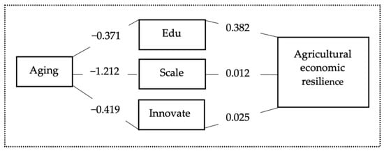 To explore whether the aging of the rural labor force weakens the resilience of agricultural economy through the reduction of rural human capital, this study further introduces the intermediary effect model, and the regression results are shown in Table 3. The results in column (1) show that the aging of the rural labor force significantly reduces the level of rural human capital, and the reduction of rural human capital directly affects the improvement of agricultural production efficiency. It is not conducive to the improvement of agricultural technological innovation and agricultural toughness. Therefore, we argue that rural labor aging weakens agricultural economic resilience by reducing rural human capital. In addition, some studies have pointed out that the shortage of an effective labor force brought about by the aging of the rural labor force will force agricultural production to adopt new production factors and new production technologies, while the reduction of the labor force will promote agricultural scale management to hedge the negative impact of aging and thus enhance the resilience of the agricultural economy. Based on this, this study further introduces the mediation effect model, takes agricultural technology innovation and agricultural scale management as the intermediary variables, and explores the mediating role of agricultural technology innovation and agricultural scale management in the influence of rural labor aging on agricultural economic resilience. The regression results are shown in columns (2) and (3). The aging of the rural labor force has a significantly negative impact on both agricultural scale management and agricultural technology innovation, indicating that the aging of the rural labor force does not reverse the progress of agricultural production technology and scale management but inhibits the progress of agricultural scale management and agricultural technology. Therefore, we believe that the aging of the rural labor force weakens the resilience of the agricultural economy by reducing rural human capital and inhibiting agricultural scale management and agricultural technological progress. The theoretical results are shown in Figure 5.