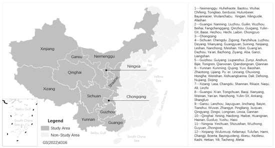 The study area covers 131 cities and ethnic minority autonomous prefectures under the jurisdiction of 12 provincial-level administrative regions in China, that is, Sichuan, Shaanxi, Gansu, Qinghai, Yunnan, Guizhou, Chongqing, Guangxi Zhuang Autonomous Region, Inner Mongolia Autonomous Region, Ningxia Hui Autonomous Region, Xinjiang Uygur Autonomous Region, and Tibet Autonomous Region, involved in the Western Region Development Strategy (Figure 1). It is noteworthy that Yangling Demonstration Zone in Shaanxi Province, Shihezi, Aral, Tumxuk, Wujiaqu, Beitun, Tiemenguan provincial county-level city, and the Xinjiang Production and Construction Corps in Xinjiang Uygur Autonomous Region are excluded from the study area due to a lack of data. Since Enshi Tujia and Miao Autonomous Prefecture in Hubei Province, Xiangxi Tujia and Miao Autonomous Prefecture in Hunan Province, and Yanbian Korean Autonomous Prefecture in Jilin Province, which enjoy China’s western development policy, are not part of the western region, they are also excluded from the study area.