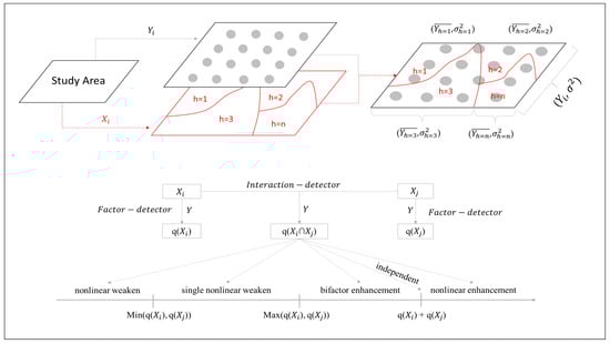 GeoDetector is an emerging spatial statistical model developed by Wang that is widely used in the analysis of factors affecting the humanities and social sciences []. The model is based on the fundamental assumption that the geographic space of the study area is divided into multiple partitions, and if the independent variable () and the dependent variable () converge in spatial distribution, the former is considered to be able to explain the latter well. The software output index represents the degree of explanation of the dependent variable by the independent variable. In the analysis of direct influence and interactive influence, the maximum value of the index is 1 and the minimum value is zero, with a larger value representing a stronger explanatory power. In this paper, q() is used to denote direct influence, and q(∩) is used to denote interactive influence. The index is calculated by the following equation []: