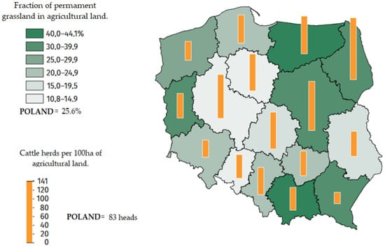 The voivodeships Wielkopolskie, Mazowieckie, and Podlaskie have the highest cattle density in Poland and the highest amounts of manure and slurry produced [18]. Figure 1 shows the fraction of permanent grassland in agricultural land and number of cattle heads in herds per 100 ha in individual voivodeships.