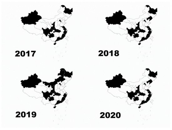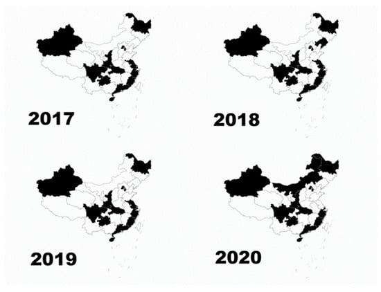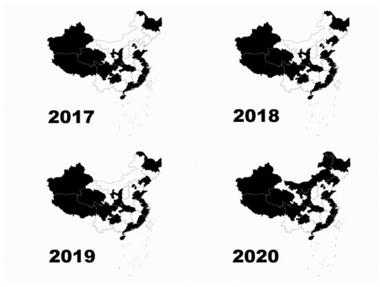 2017–2020 Distribution of provinces in 31 Chinese provinces where the pure technical efficiency of agricultural circular economy reaches DEA effectiveness.