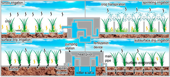 SDI technology is renowned for its water- and fertilizer-saving abilities and high degree of automation. Water and fertilizer are delivered directly to crop roots through pipes buried in the tilled layer. As shown in Figure 1, compared with other irrigation methods, SDI can significantly reduce water loss through surface evaporation, enhance irrigation efficiency, improve crop net photosynthesis, and reduce crop transpiration [8]. In addition, SDI can effectively control weed growth, inhibit the proliferation of soil diseases and insect pests, reduce pesticide use, and significantly improve crop yield and quality [9,10]. In this study, we analyzed the literature on SDI in the core collection of the Web of Science to provide insights into research trends and emerging issues in the field. Our study elucidates the current issues of concern and provides informed directions for development in the field of SDI.