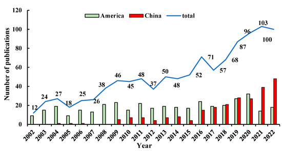 Annual publication volume is a critical indicator of a particular research field’s developmental trends, based on the level of research activity and interest in a specific area [12]. Figure 2 illustrates the annual publication volumes for studies relating to SDI and the associated countries. Overall, the number of publications steadily increased over time. However, a slight decrease in the number of publications was observed in 2005, 2012, and 2017. The highest number of publications occurred in 2021, suggesting that the issue of agricultural water shortages is gaining increasing attention, and research on SDI is expanding.