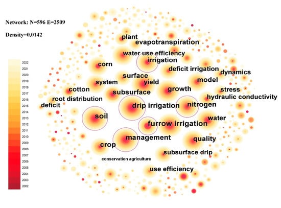 Keywords with a high BC represent the most important research areas in SDI. Figure 4 shows six keywords with high centrality: soil (0.17), furrow irrigation (0.13), drip irrigation (0.11), irrigation (0.10), management (0.10), and nitrogen (0.10). Soil is a fundamental component of crop production. The physical and chemical properties of soil have a considerable influence on the effectiveness of SDI. Based on the degree of permeability, sandy soil is more suitable for SDI compared to the more compact clayey soil, which is also vulnerable to uneven water and fertilizer distribution [18]. Soil temperature, pH, and salt content affect the ability of plants to absorb and utilize water and nutrients [19,20]. Furrow, drip, and irrigation were closely associated with the search terms used in this study. Compared with other irrigation methods, SDI yields higher water use efficiency, less soil erosion, and greater water conservation and is more conducive to improving crop yield and quality. Furthermore, it also reduces labor intensity [21,22]. SDI management encompasses irrigation scheduling, fertilization, system maintenance, and soil crop management. Effective management strategies are essential for enhancing crop yield and quality, maintaining soil health, improving water and fertilizer use efficiency, and achieving sustainable crop production [23]. Nitrogen is an important nutrient in crop growth and directly affects yield. Variations in irrigation methods can significantly affect nitrogen use efficiency. Studies have demonstrated that SDI can improve nitrogen utilization efficiency while reducing nitrogen loss [24,25]. Additionally, SDI can be combined with other measures, such as soil testing, mulch planting, and crop rotation, to optimize nitrogen use efficiency [24,25,26].