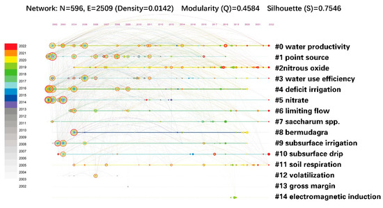 To further refine the research content and identify research hotspots, tags with the same theme were summarized into nine parts (tags #9 and #10 were excluded because of their close association with the search term). Part 1 (#0 water productivity and #3 water use efficiency) includes 126 nodes, and the main years of #0 and #3 were 2012 and 2011, respectively. Part 2 (#2 nitrous oxide and #5 nitrate) contained 109 nodes, and the main years for #2 and #5 were 2016 and 2007, respectively. Part 3 (#4 deficit irrigation and #6 limiting flow) had 90 nodes, with the main year being 2010. Part 4 (#7 Saccharum spp. and #8 Bermudagra (Bermuda grass)) had a total of 73 nodes, and the main years of #7 and #8 were 2013 and 2012, respectively. Part 5 (#1 point source) appeared in 2009 and contained 65 nodes. Part 6 (#11 soil respiration) had 30 nodes and appeared in 2015. Part 7 (#12 volatilization) had 19 nodes, and the main year was 2005. Part 8 (#13 gross margin) had six nodes, and its main year was 2009. Finally, Part 9 (#14 electromagnetic induction) comprised six nodes, and its primary year was 2019.