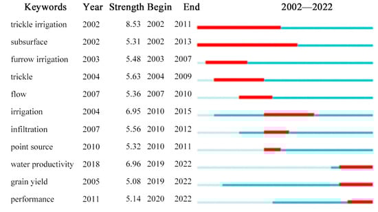 Figure 6 shows that the burst intensity for words before 2007 were strongly correlated with the search terms used in this study. “Trickle irrigation” had the highest burst intensity, whereas “subsurface” had the longest burst duration. Between 2002 and 2022, research focused on the characteristics of SDI. In 2010, three keywords showed a high burst intensity, among which “irrigation” appeared in 2004 and was associated with several burst words of the previous publication period. The studies of drip distribution in irrigation systems and water infiltration distribution also gained attention during this period. Finally, the close association in the burst timing of “water productivity”, “grain yield”, and “performance” represents the latest hot topics in SDI research. Therefore, we expect that SDI system research and development will continue to focus on improving yield and water conservation.