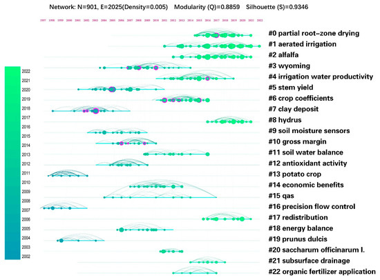 We divided the timeline map into four parts. The first part covered the period before 2002, during which the research directions included #7 clay deposit, #13 potato crop, #16 precision flow control, and #19 Prunus dulcis. The second part spans 2002–2008, comprising the research directions #5 stem yield, #9 soil moisture sensors, #3 Wyoming, #10 gross margin, #12 antioxidant activity, #15 quality assurance standard (QAS), #14 economic benefits, and #18 energy balance. The third part spans 2008–2014, comprising the research directions #11 soil water balance, #4 irrigation water productivity, #6 crop coefficients, #1 aerated irrigation, #2 alfalfa, #20 Saccharum officinarum L., and #22 organic fertilizer application. Finally, the research directions of the fourth part, spanning 2014–2022, comprised #0 partial root-zone drying, #1 aerated irrigation, #2 alfalfa, #8 Hydrus, #17 redistribution, and #21 subsurface drainage.