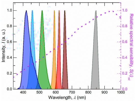 The emission spectrum of each LED was measured using a fiber optic CCD BLUE-Wave Miniature spectrometer (StellarNet Inc., Tampa, FL, USA). The photodiode used was a PN junction silicon photodiode model TEFD4300 (Vishay Intertechnology, Inc., Malvern, PA, USA). Figure 2 shows the emission spectrum of each LED, as well as the relative spectral sensitivity of the photodiode, while Table 2 shows the denomination given to each band, its median wavelength λmed, the wavelength of maximum intensity λmax, and the half-width at half maximum of the spectrum Δλ. If the use of a different wavelength is required for a specific application, it would suffice to place an additional LED with the appropriate wavelength.
