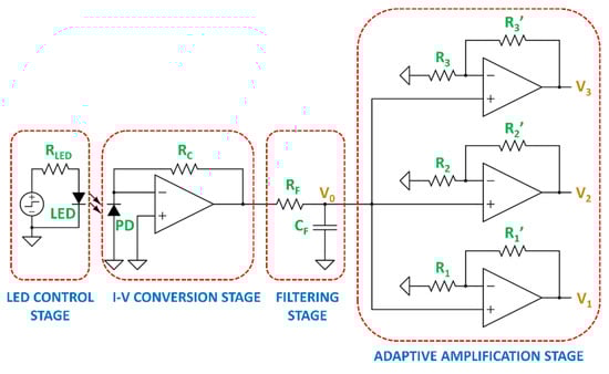 The acquisition circuit consists of four stages: a first stage corresponding to the LED control, a second stage in which the current generated by the photodiode is converted to voltage, a third low-pass filtering stage, and a fourth adaptive amplification stage. Finally, the amplified signal is fed into a 10-bit analog-to-digital converter (ADC) for numerical processing. A schematic of the signal acquisition circuit is shown in Figure 3.